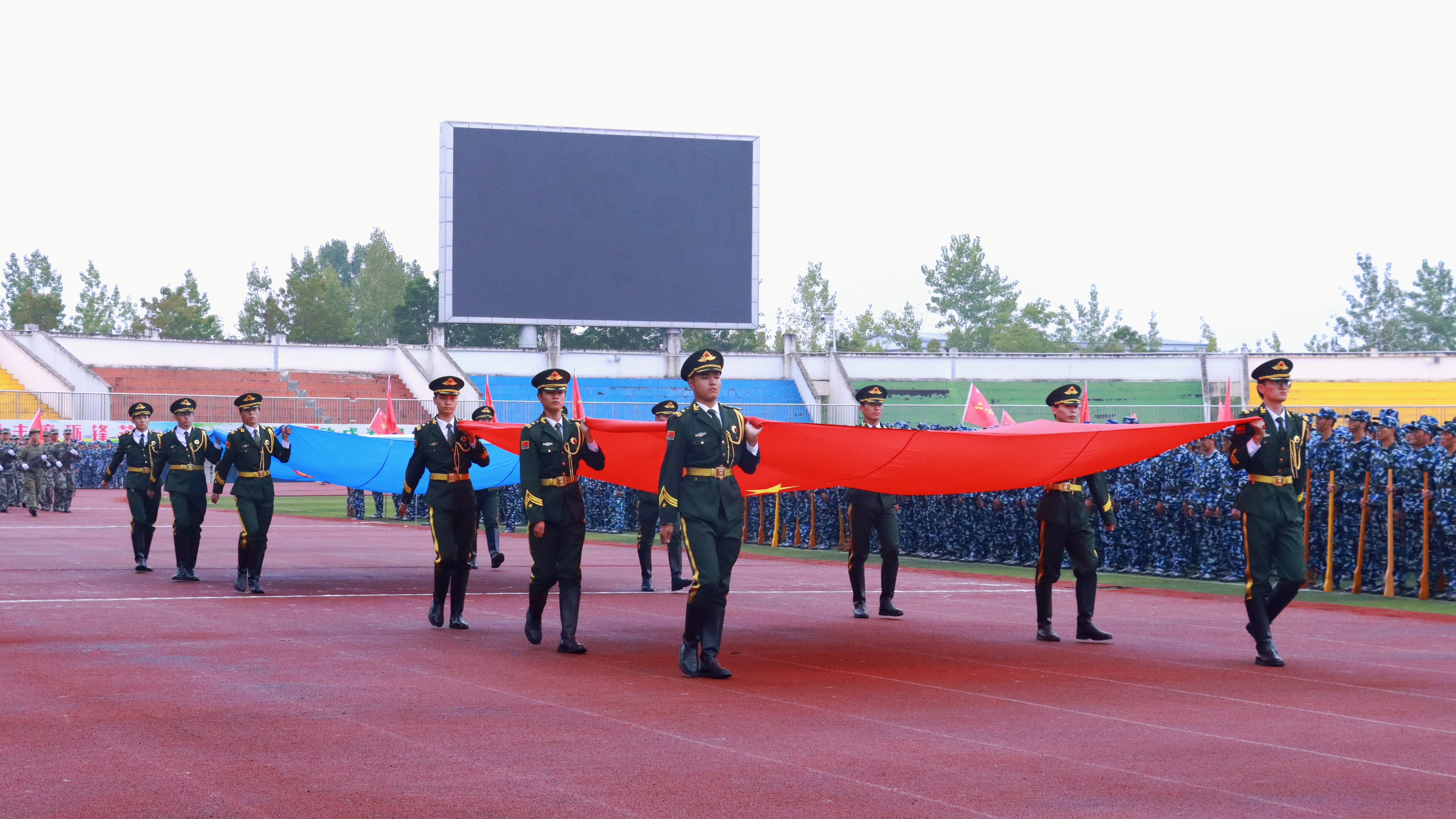 在庄严的国歌声中,开学典礼暨军训汇演正式拉开帷幕。面向国旗,承训部队官兵及在场师生共同唱响国歌。