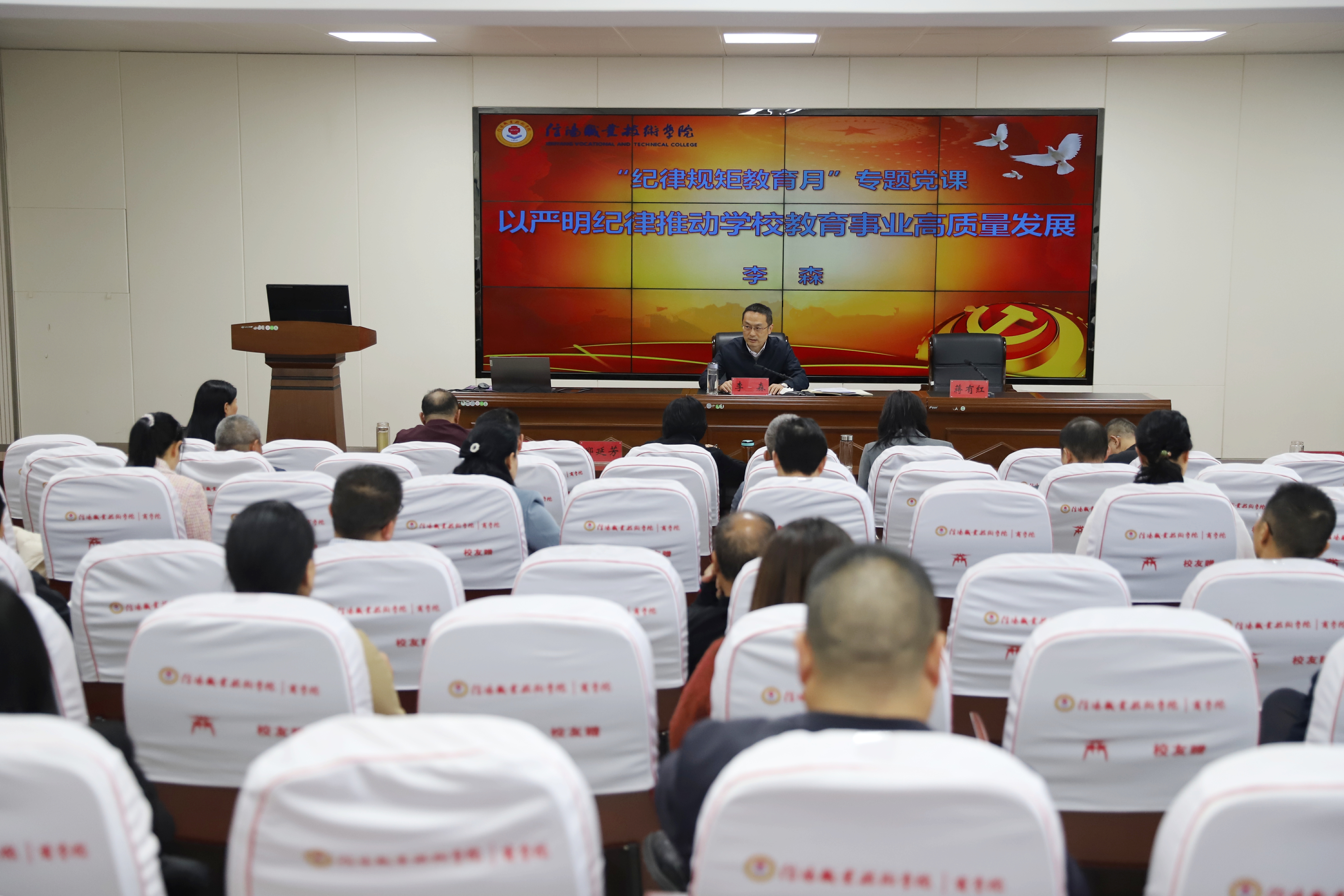 为深入贯彻落实市委“严纪律、重规矩、强作风”长效机制部署要求,根据全市“纪律规矩教育月”活动安排,近日,学校党委副书记、校长李森以《以严明纪律推动学校教育事业高质量发展》为题,讲授专题纪法党课。学校领导班子,各中层正职、部门负责人及二级院部纪检委员参加了党课教育。党课由党委副书记蒋有红主持。