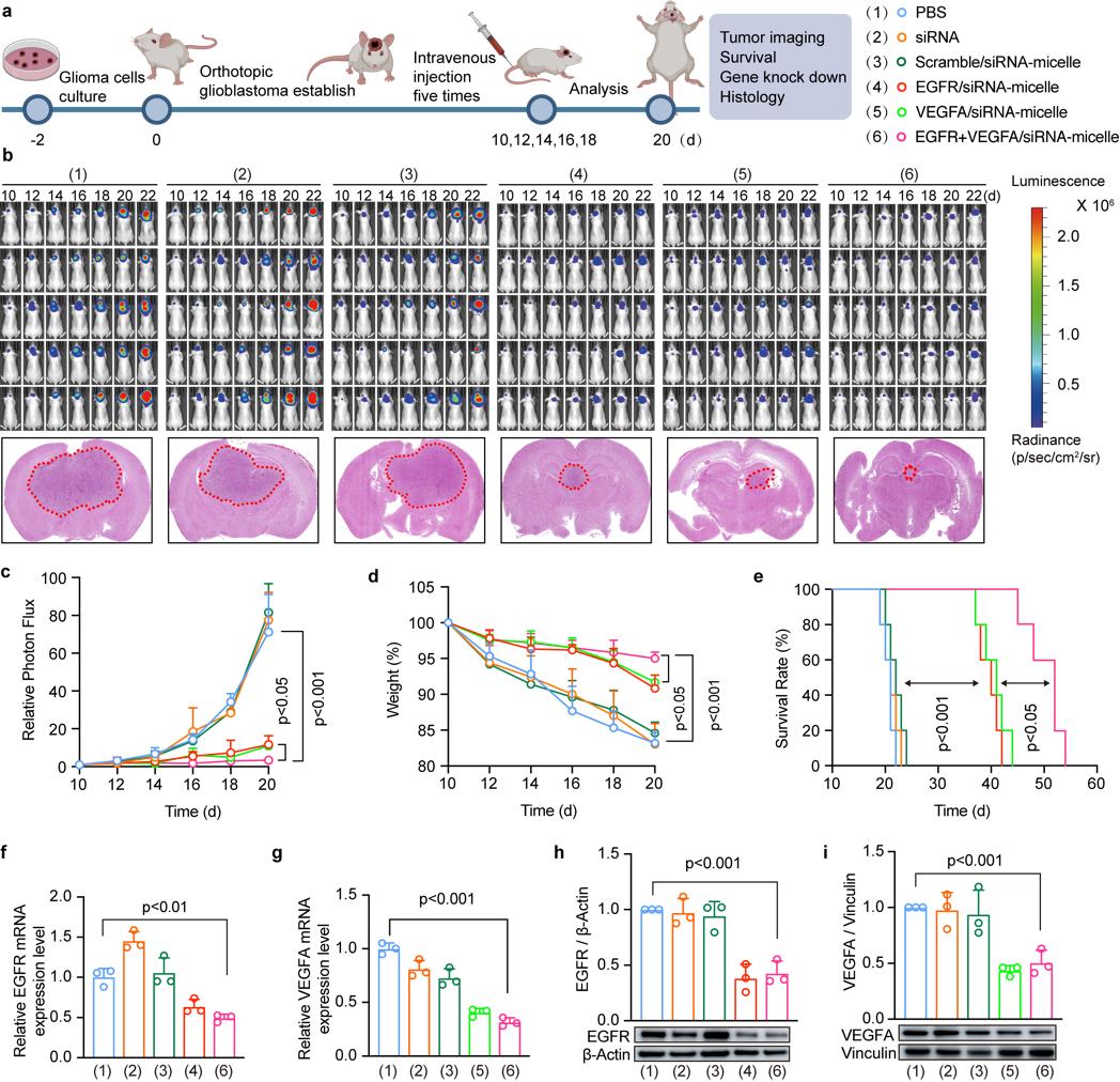 针对这一世界性医学难题,研究团队受球形核酸纳米药物启发,创新性构建了一种新型非阳离子二十二碳六烯酸(DHA)基 siRNA 胶束递送系统。该系统通过点击化学反应与亲疏水自组装制备而成,核心材料均获得美国 FDA 批准,从源头保障了制剂的生物安全性;同时可通过清道夫受体 A(SR-A)介导实现肿瘤精准递送,有效突破血脑屏障壁垒,完成脑部病灶的靶向富集与细胞摄取。