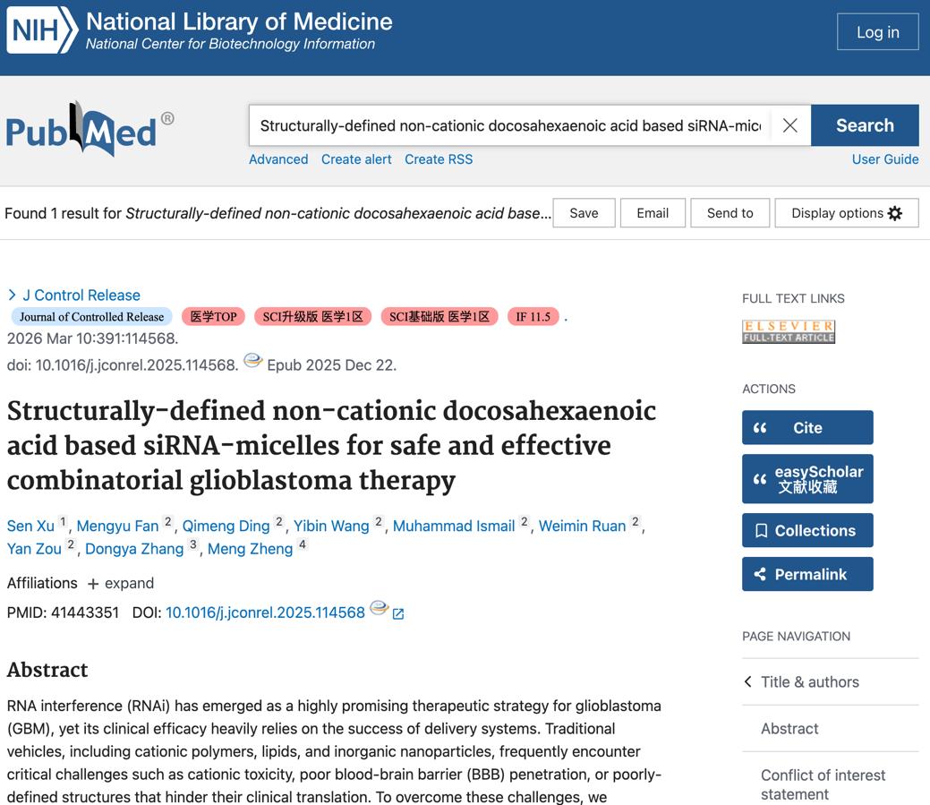 近日,我校医学院青年教师徐森(学校“高层次人才引进计划”引进人才,“青年英才培育计划”培养对象)依托信阳职业技术学院与河南大学访学项目,联合河南大学科研团队在恶性脑肿瘤基因治疗与纳米药物递送领域取得重大突破性进展。相关研究成果以《Structurally-defined non-cationic docosahexaenoic acid based siRNA-micelles for safe and effective combinatorial glioblastoma therapy》为题,正式发表于国际医学领域顶级学术期刊《Journal of Controlled Release》,为胶质母细胞瘤的临床治疗研究提供了全新方案,也充分彰显了我校人才强校战略的落地成效与医药学科领域的强劲科研创新实力。