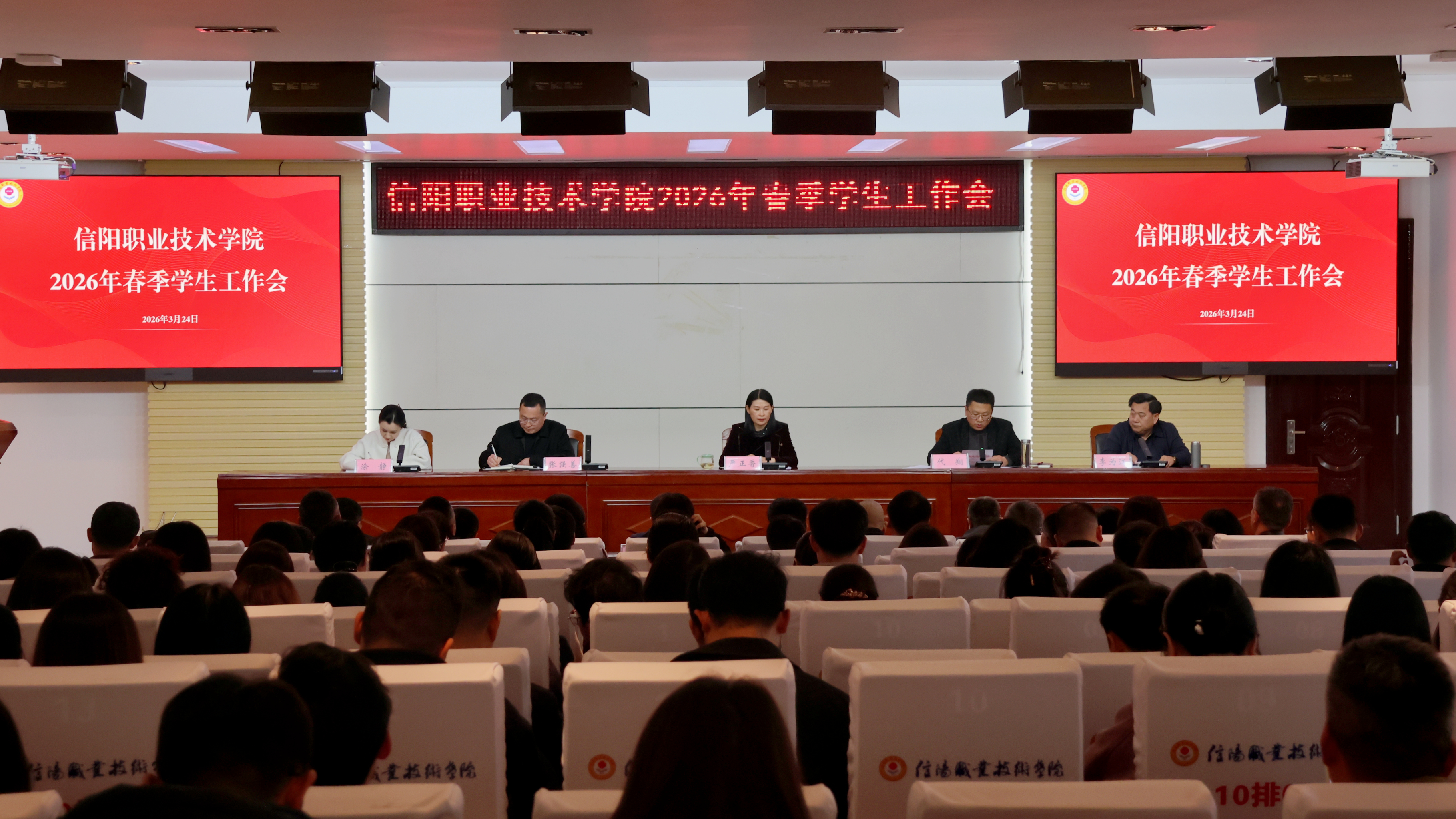3月24日下午,学校召开2026年春季学生工作会。学校党委委员、副校长严正香、相关部门负责人、各二级学院书记、全体学工干部、专兼职辅导员参加会议。会议由学生处处长代翔主持。